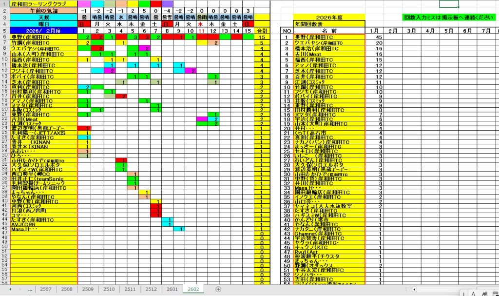 <サイクルの点検、整備、安全に葛城山へ・・上がろう~> <注意・・・落石・枝折れ・倒木・穴ぼこ・落車したら骨折します・> 葛城山の下りは安全運転、油断大敵<車>に注意!・・・・安全第一 ・・葛城山は真冬を迎える・・ー5℃~0℃~雨が降ったら、雪に・・・防寒防雪対策を ☆彡葛城山、2/12日~より、当分雪解け・・・☆彡 ![]() 2026/二月 ゆたか茶屋で一休み・・// 茶屋の休日カレンダー・・・UP画像・・・ ☆彡あなたの今月、目標は・・・☆彡 葛城山登頂 回数表 2026/02月度 2/01~12・・ NO-01 掲示板 記帳表 2026 2月度 2/01~12・ 1/31~2/1 1~04・・ 04~07・ 07~12・・・ 2025// 1~12月度 年間回数 累計・・・NO-01 NO-02 NO-03 葛城山登頂 回数表 2026/01月度 1/01~31・・ NO-01 NO-02 <今後、単独の鍋谷コースは管理できないので、経由、2本目の葛城山でカウントします。> *掲示板下の写真入れに・・<葛城山のナイスショット画像プレゼント中・・> 掲示板、在庫数量・・<KTCジャージの受付・・窓口、橋本治・ウエバヤシ・> ☆彡 2005~2025まで・・年間 100本以上 葛城山サイクル登頂者 集計ミスは随時訂正・・ NO-01 NO-02 NO-03 NO-04 NO-05 NO-06 NO-07 NO-08 NO-09 NO-10 2026/1月度<80人登頂 332回> 奥野ー45//ウエバヤシー20//古川ー16//橋本ー16//福西ー15// アマノー12//百井ー12//芝本ー12//江渕ー11//フjキー10//竹綱ー10// 東野ー09//ポパイー09//井阪ー09//田村勝利ー08//ヌマター07// 葛城山登頂 回数表 2025/12月度 01~31日・・・NO-01 NO-02 2025/11月度 01~30日 回数表 NO-01 NO-02 NO-03 2025/10月度 回数表 1~30・・ NO-01 NO-02 NO-03 9月度 回数表 2025/09/01~30・・NO-01 NO-02 NO-03 NO-04 8月度 回数表 2025/08/01~31・・NO-01 NO-02 NO-03 NO-04 7月度回数表 2025/07/01~31・・ NO-01 NO-02 NO-03 NO-04 2025/06/01~30・・・回数表 NO-01 NO-02 NOー03 NO-04 2025 5/01~31・・回数表 NO-01 NO-02 NO-03 NO-04 2025 04/01~30・・回数表 2025・・・NO-01 N0-02 NO-03 NO-04 2025 3/01~31 回数表 NOー01 NO-02 NO-03 NOー04 2025 2/01~28 回数表 NO-01 NO-02 20251/01~31★回数表 NO-01 NO-02 NO-03 2005~2024年まで100回以上・・葛城山へ上がった・累計・・ NO-01 NO-02 NO-03 NOー04 NO-05 NO-06 訂NO-07 NO-08 NO-09 |