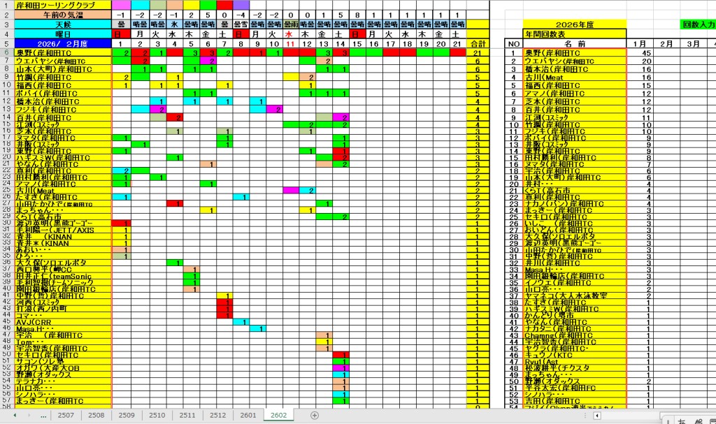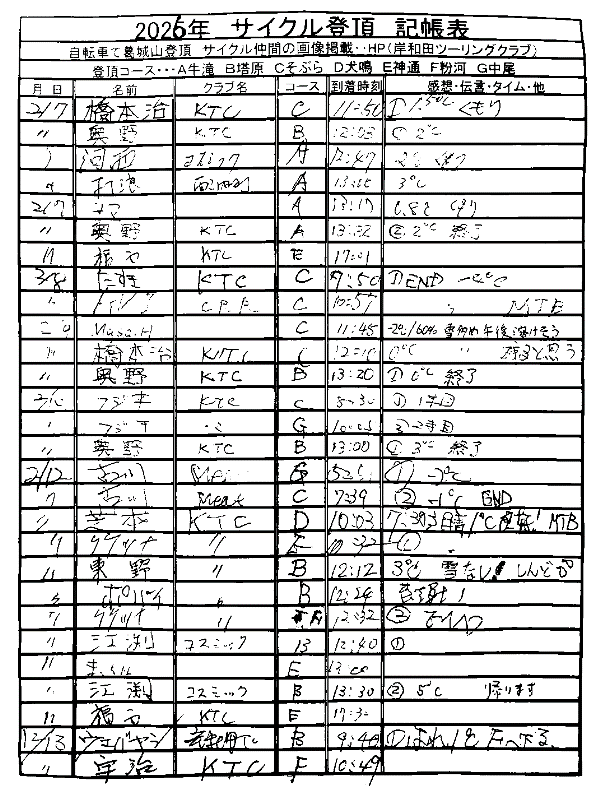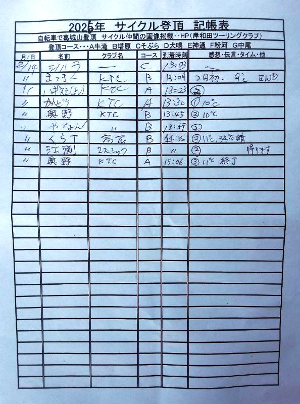 <サイクルの点検、整備、安全に葛城山へ・・上がろう~> <注意・・・落石・枝折れ・倒木・穴ぼこ・落車したら骨折します・> 葛城山の下りは安全運転、油断大敵<車>に注意!・・・・安全第一 ・・葛城山は真冬を迎える・・ー5℃~0℃~雨が降ったら、雪に・・・防寒防雪対策を ☆彡葛城山、2/12日~より、当分雪解け・・・☆彡 ![]() 2026/二月 ゆたか茶屋で一休み・・// 茶屋の休日カレンダー・・・UP画像・・・ ☆彡あなたの今月、目標は・・・☆彡 葛城山登頂 回数表 2026/02月度 2/01~14・・ NO-01 掲示板 記帳表 2026 2月度 2/01~14・ 1/31~2/1 1~04・・ 04~07・ 07~13 13~14 14~・・・ 2025// 1~12月度 年間回数 累計・・・NO-01 NO-02 NO-03 葛城山登頂 回数表 2026/01月度 1/01~31・・ NO-01 NO-02 <今後、単独の鍋谷コースは管理できないので、経由、2本目の葛城山でカウントします。> *掲示板下の写真入れに・・<葛城山のナイスショット画像プレゼント中・・> 掲示板、在庫数量・・<KTCジャージの受付・・窓口、橋本治・ウエバヤシ・> ☆彡 2005~2025まで・・年間 100本以上 葛城山サイクル登頂者 集計ミスは随時訂正・・ NO-01 NO-02 NO-03 NO-04 NO-05 NO-06 NO-07 NO-08 NO-09 NO-10 2026/1月度<80人登頂 332回> 奥野ー45//ウエバヤシー20//古川ー16//橋本ー16//福西ー15// アマノー12//百井ー12//芝本ー12//江渕ー11//フjキー10//竹綱ー10// 東野ー09//ポパイー09//井阪ー09//田村勝利ー08//ヌマター07// 葛城山登頂 回数表 2025/12月度 01~31日・・・NO-01 NO-02 2025/11月度 01~30日 回数表 NO-01 NO-02 NO-03 2025/10月度 回数表 1~30・・ NO-01 NO-02 NO-03 9月度 回数表 2025/09/01~30・・NO-01 NO-02 NO-03 NO-04 8月度 回数表 2025/08/01~31・・NO-01 NO-02 NO-03 NO-04 7月度回数表 2025/07/01~31・・ NO-01 NO-02 NO-03 NO-04 2025/06/01~30・・・回数表 NO-01 NO-02 NOー03 NO-04 2025 5/01~31・・回数表 NO-01 NO-02 NO-03 NO-04 2025 04/01~30・・回数表 2025・・・NO-01 N0-02 NO-03 NO-04 2025 3/01~31 回数表 NOー01 NO-02 NO-03 NOー04 2025 2/01~28 回数表 NO-01 NO-02 20251/01~31★回数表 NO-01 NO-02 NO-03 2005~2024年まで100回以上・・葛城山へ上がった・累計・・ NO-01 NO-02 NO-03 NOー04 NO-05 NO-06 訂NO-07 NO-08 NO-09 |