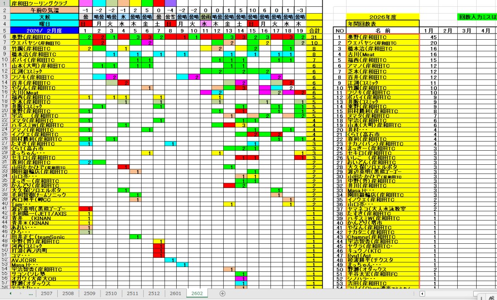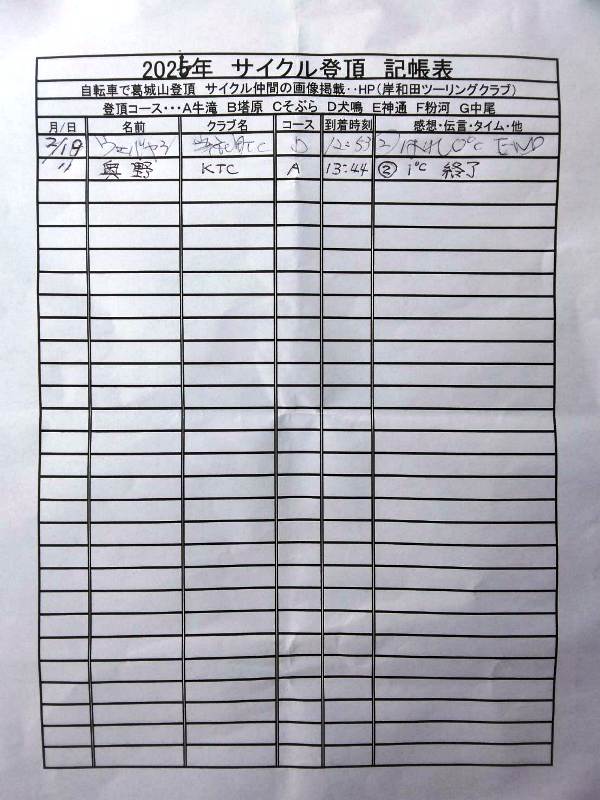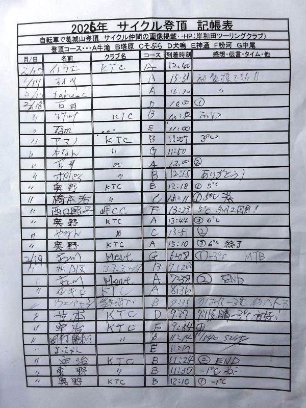 <サイクルの点検、整備、安全に葛城山へ・・上がろう~> <注意・・・落石・枝折れ・倒木・穴ぼこ・落車したら骨折します・> 葛城山の下りは安全運転、油断大敵<車>に注意!・・・・安全第一 ・・葛城山は真冬を迎える・・ー5℃~0℃~雨が降ったら、雪に・・・防寒防雪対策を ☆彡葛城山、2/12日~より、当分雪解け・・・☆彡 ![]() ![]() 2026/02/17 和泉環境リサイクル公園の梅と水仙、5部咲き、橋本治さん撮影 2026/二月 ゆたか茶屋で一休み・・// 茶屋の休日カレンダー・・・UP画像・・・ ☆彡あなたの今月、目標は・・・☆彡 葛城山登頂 回数表 2026/02月度 2/01~19・・ NO-01 NO-02 掲示板 記帳表 2026 2月度 2/01~19・ 1/31~2/1 1~04・・ 04~07・ 07~13 13~14 14~15 15~19 19~・・・ 2025// 1~12月度 年間回数 累計・・・NO-01 NO-02 NO-03 葛城山登頂 回数表 2026/01月度 1/01~31・・ NO-01 NO-02 <今後、単独の鍋谷コースは管理できないので、経由、2本目の葛城山でカウントします。> *掲示板下の写真入れに・・<葛城山のナイスショット画像プレゼント中・・> 掲示板、在庫数量・・<KTCジャージの受付・・窓口、橋本治・ウエバヤシ・> ☆彡 2005~2025まで・・年間 100本以上 葛城山サイクル登頂者 集計ミスは随時訂正・・ NO-01 NO-02 NO-03 NO-04 NO-05 NO-06 NO-07 NO-08 NO-09 NO-10 2026/1月度<80人登頂 332回> 奥野ー45//ウエバヤシー20//古川ー16//橋本ー16//福西ー15// アマノー12//百井ー12//芝本ー12//江渕ー11//フjキー10//竹綱ー10// 東野ー09//ポパイー09//井阪ー09//田村勝利ー08//ヌマター07// 葛城山登頂 回数表 2025/12月度 01~31日・・・NO-01 NO-02 2025/11月度 01~30日 回数表 NO-01 NO-02 NO-03 2025/10月度 回数表 1~30・・ NO-01 NO-02 NO-03 9月度 回数表 2025/09/01~30・・NO-01 NO-02 NO-03 NO-04 8月度 回数表 2025/08/01~31・・NO-01 NO-02 NO-03 NO-04 7月度回数表 2025/07/01~31・・ NO-01 NO-02 NO-03 NO-04 2025/06/01~30・・・回数表 NO-01 NO-02 NOー03 NO-04 2025 5/01~31・・回数表 NO-01 NO-02 NO-03 NO-04 2025 04/01~30・・回数表 2025・・・NO-01 N0-02 NO-03 NO-04 2025 3/01~31 回数表 NOー01 NO-02 NO-03 NOー04 2025 2/01~28 回数表 NO-01 NO-02 20251/01~31★回数表 NO-01 NO-02 NO-03 2005~2024年まで100回以上・・葛城山へ上がった・累計・・ NO-01 NO-02 NO-03 NOー04 NO-05 NO-06 訂NO-07 NO-08 NO-09 |