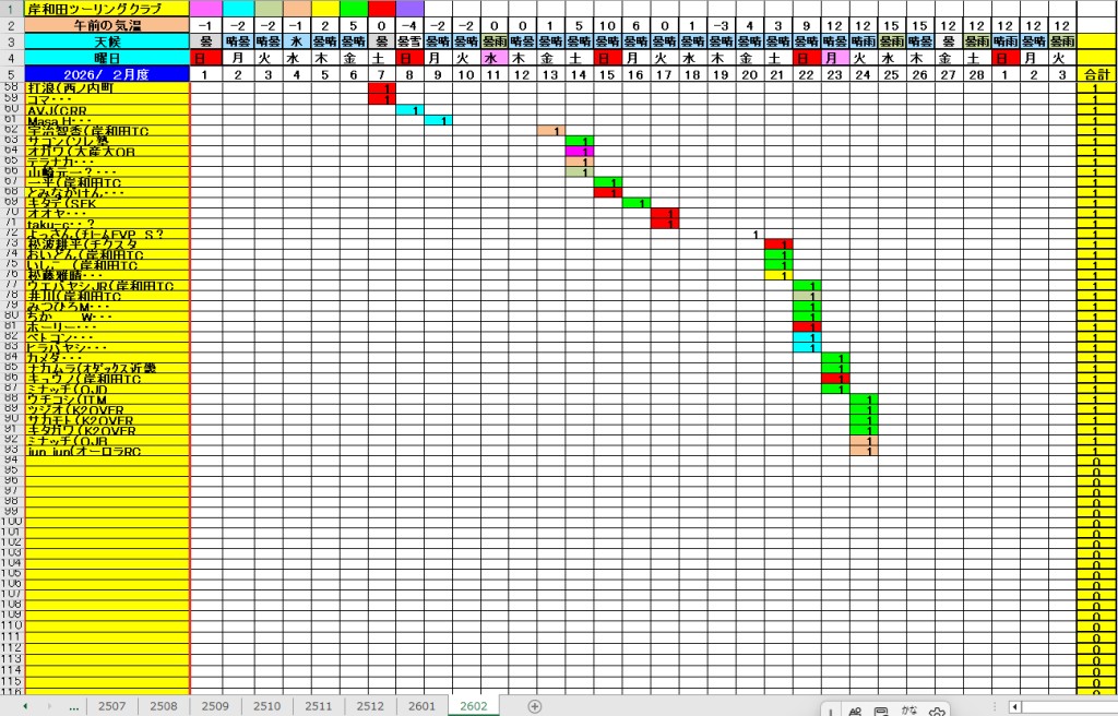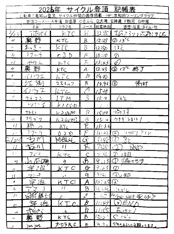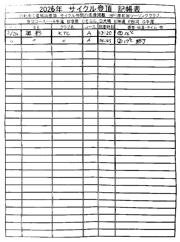 <サイクルの点検、整備、安全に葛城山へ・・上がろう~> <注意・・・落石・枝折れ・倒木・穴ぼこ・落車したら骨折します・> 葛城山の下りは安全運転、油断大敵<車>に注意!・・・・安全第一 ・・葛城山に春の兆し・・5℃~10℃・・・塔原コースで梅の花が咲いた・・ ![]() ![]() 2026/02/21梅が咲いた~か、サクラ~はまだかいな~//庭の小梅が咲いた! 2026/二月 ゆたか茶屋で一休み・・// 茶屋の休日カレンダー・・・UP画像・・・ ☆彡あなたの今月、目標は・・・☆彡 葛城山登頂 回数表 2026/02月度 2/01~24・・ NO-01 NO-02 掲示板 記帳表 2026 2月度 2/01~24 1/31~2/1 1~04・・ 04~07・ 07~13 13~14 14~15 15~19 19~21 21~22 22~23 23~24 24~・・ 2025// 1~12月度 年間回数 累計・・・NO-01 NO-02 NO-03 葛城山登頂 回数表 2026/01月度 1/01~31・・ NO-01 NO-02 <今後、単独の鍋谷コースは管理できないので、経由、2本目の葛城山でカウントします。> *掲示板下の写真入れに・・<葛城山のナイスショット画像プレゼント中・・> 掲示板、在庫数量・・<KTCジャージの受付・・窓口、橋本治・ウエバヤシ・> ☆彡 2005~2025まで・・年間 100本以上 葛城山サイクル登頂者 集計ミスは随時訂正・・ NO-01 NO-02 NO-03 NO-04 NO-05 NO-06 NO-07 NO-08 NO-09 NO-10 2026/1月度<80人登頂 332回> 奥野ー45//ウエバヤシー20//古川ー16//橋本ー16//福西ー15// アマノー12//百井ー12//芝本ー12//江渕ー11//フjキー10//竹綱ー10// 東野ー09//ポパイー09//井阪ー09//田村勝利ー08//ヌマター07// 葛城山登頂 回数表 2025/12月度 01~31日・・・NO-01 NO-02 2025/11月度 01~30日 回数表 NO-01 NO-02 NO-03 2025/10月度 回数表 1~30・・ NO-01 NO-02 NO-03 9月度 回数表 2025/09/01~30・・NO-01 NO-02 NO-03 NO-04 8月度 回数表 2025/08/01~31・・NO-01 NO-02 NO-03 NO-04 7月度回数表 2025/07/01~31・・ NO-01 NO-02 NO-03 NO-04 2025/06/01~30・・・回数表 NO-01 NO-02 NOー03 NO-04 2025 5/01~31・・回数表 NO-01 NO-02 NO-03 NO-04 2025 04/01~30・・回数表 2025・・・NO-01 N0-02 NO-03 NO-04 2025 3/01~31 回数表 NOー01 NO-02 NO-03 NOー04 2025 2/01~28 回数表 NO-01 NO-02 20251/01~31★回数表 NO-01 NO-02 NO-03 2005~2024年まで100回以上・・葛城山へ上がった・累計・・ NO-01 NO-02 NO-03 NOー04 NO-05 NO-06 訂NO-07 NO-08 NO-09 |