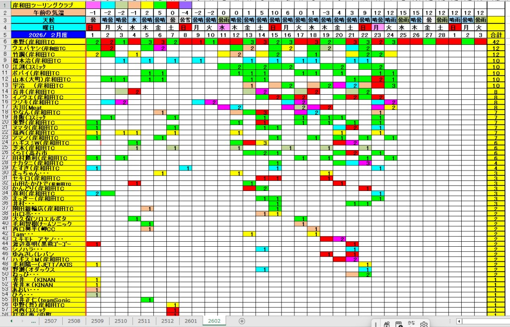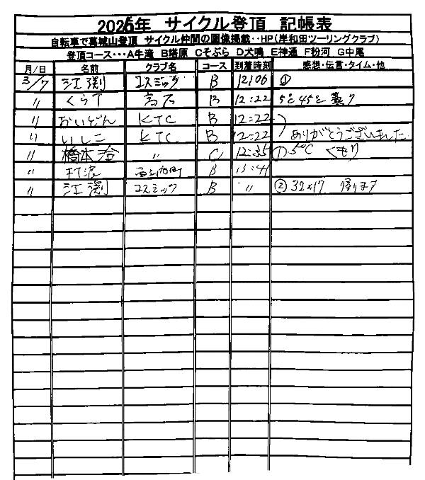 < 2025年度 7葛、達成者> 3/23 たすき(7葛) 4/16 松波耕平(7葛) 4/25 宇治友博(7葛) 4/27 ミナッチ(7葛) 5/01 イナヤマ(7葛) 5/26 タケ(サガ)(7葛) 5/26 相良(7葛) 8/31 コセコ(7葛)・ 8/31 木下(7葛) 9/17 ハギスミM(7葛) 9/24 オクダ(7葛) |