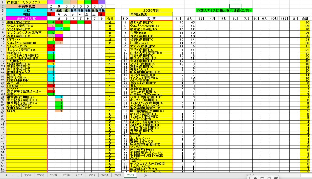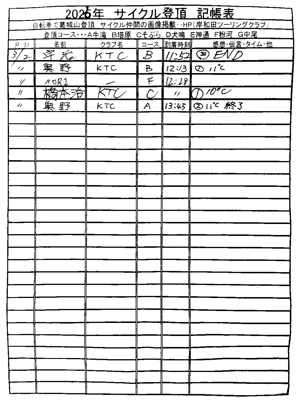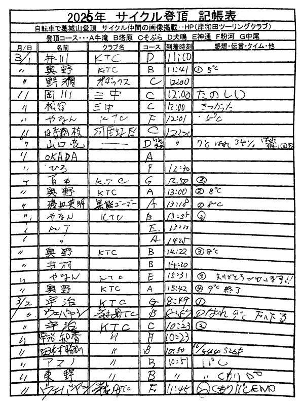 <サイクルの点検、整備、安全に葛城山へ・・上がろう~> <注意・・・落石・枝折れ・倒木・穴ぼこ・落車したら骨折します・> 葛城山の下りは安全運転、油断大敵<車>に注意!・・・・安全第一 ・・葛城山に春の兆し・・5℃~10℃・・・中尾コースで咲いた、しだれ桜? ![]() 2026/02/21 中尾コースの切畑で見つけた、しだれ桜?梅?// UP画像・・・ 2026/三月度 ゆたか茶屋の休み・・// 茶屋の休日カレンダー・・・UP画像・・・ 2026/2月度<89人登頂 357回> 奥野ー45//ウエバヤシー16//宇治ー15//山本大町ー15//竹綱ー14// 橋本ー12//江渕ー12//ポパイー11//古川ー10//イノウエー10// 福西ー10//東野ー09//アマノー09//百井ー08//フジキー08// やなんー07//井阪ー07//ヌマター07//田村勝利ー07//芝本ー07// ☆彡あなたの今月登頂回数は・・・☆彡 03月度 回数表 2026/3/02~・・・ NO-01 掲示板 記帳表 2026 3月度 3/02~・・・ 24~28 28~3/01 01~02 02~・・・ 葛城山登頂 累計回数表 2026/1~02月度 NO-01 NO-02 <今後、単独の鍋谷コースは管理できないので、経由、2本目の葛城山でカウントします。> *掲示板下の写真入れに・・<葛城山のナイスショット画像プレゼント中・・> 掲示板、在庫数量・・<KTCジャージの受付・・窓口、橋本治・ウエバヤシ・> 2025// 1~12月度 年間回数 累計・・・NO-01 NO-02 NO-03 ☆彡 2005~2025まで・・年間 100本以上 葛城山サイクル登頂者 集計ミスは随時訂正・・ NO-01 NO-02 NO-03 NO-04 NO-05 NO-06 NO-07 NO-08 NO-09 NO-10 回数表 2026/02月度 2/01~28・・ NO-01 NO-02 回数表 2026/01月度 1/01~31 NO-01 NO-02 回数表 2025/12月度 01~31日・・・NO-01 NO-02 2025/11月度 01~30日 回数表 NO-01 NO-02 NO-03 2025/10月度 回数表 1~30・・ NO-01 NO-02 NO-03 9月度 回数表 2025/09/01~30・・NO-01 NO-02 NO-03 NO-04 8月度 回数表 2025/08/01~31・・NO-01 NO-02 NO-03 NO-04 7月度回数表 2025/07/01~31・・ NO-01 NO-02 NO-03 NO-04 2025/06/01~30・・・回数表 NO-01 NO-02 NOー03 NO-04 2025 5/01~31・・回数表 NO-01 NO-02 NO-03 NO-04 2025 04/01~30・・回数表 2025・・・NO-01 N0-02 NO-03 NO-04 2025 3/01~31 回数表 NOー01 NO-02 NO-03 NOー04 2025 2/01~28 回数表 NO-01 NO-02 20251/01~31★回数表 NO-01 NO-02 NO-03 2005~2024年まで100回以上・・葛城山へ上がった・累計・・ NO-01 NO-02 NO-03 NOー04 NO-05 NO-06 訂NO-07 NO-08 NO-09 |