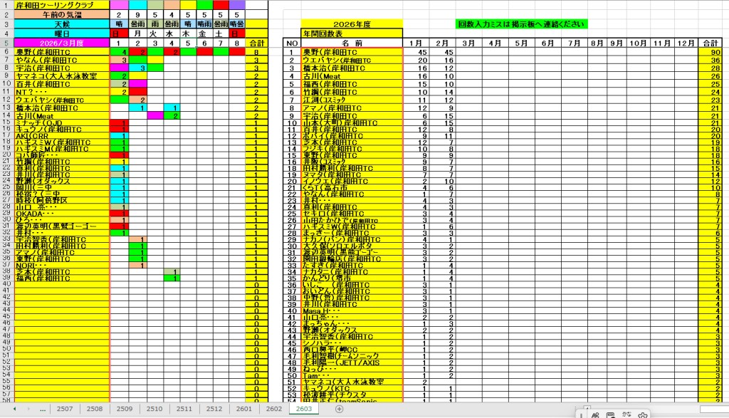 <サイクルの点検、整備、安全に葛城山へ・・上がろう~> <注意・・・落石・枝折れ・倒木・穴ぼこ・落車したら骨折します・> 葛城山の下りは安全運転、油断大敵<車>に注意!・・・・安全第一 ・・葛城山に春の兆し・・5℃~10℃・・・中尾コースで咲いた、しだれ桜? ![]() 2026/02/21 中尾コースの切畑で見つけた、しだれ桜?梅?// UP画像・・・ 2026/三月度 ゆたか茶屋の茶屋の休日カレンダー(5日PM休みます)//UP画像・・ 2026/2月度<89人登頂 357回> 奥野ー45//ウエバヤシー16//宇治ー15//山本大町ー15//竹綱ー14// 橋本ー12//江渕ー12//ポパイー11//古川ー10//イノウエー10// 福西ー10//東野ー09//アマノー09//百井ー08//フジキー08// やなんー07//井阪ー07//ヌマター07//田村勝利ー07//芝本ー07// ☆彡あなたの今月登頂回数は・・・☆彡 03月度 回数表 2026/3/04~・・・ NO-01 掲示板 記帳表 2026 3月度 3/04~・・・ 24~28 28~3/01 01~02 02~03・・・ 葛城山登頂 累計回数表 2026/1~02月度 NO-01 NO-02 <今後、単独の鍋谷コースは管理できないので、経由、2本目の葛城山でカウントします。> *掲示板下の写真入れに・・<葛城山のナイスショット画像プレゼント中・・> 掲示板、在庫数量・・<KTCジャージの受付・・窓口、橋本治・ウエバヤシ・> 2025// 1~12月度 年間回数 累計・・・NO-01 NO-02 NO-03 ☆彡 2005~2025まで・・年間 100本以上 葛城山サイクル登頂者 集計ミスは随時訂正・・ NO-01 NO-02 NO-03 NO-04 NO-05 NO-06 NO-07 NO-08 NO-09 NO-10 回数表 2026/02月度 2/01~28・・ NO-01 NO-02 回数表 2026/01月度 1/01~31 NO-01 NO-02 回数表 2025/12月度 01~31日・・・NO-01 NO-02 2025/11月度 01~30日 回数表 NO-01 NO-02 NO-03 2025/10月度 回数表 1~30・・ NO-01 NO-02 NO-03 9月度 回数表 2025/09/01~30・・NO-01 NO-02 NO-03 NO-04 8月度 回数表 2025/08/01~31・・NO-01 NO-02 NO-03 NO-04 7月度回数表 2025/07/01~31・・ NO-01 NO-02 NO-03 NO-04 2025/06/01~30・・・回数表 NO-01 NO-02 NOー03 NO-04 2025 5/01~31・・回数表 NO-01 NO-02 NO-03 NO-04 2025 04/01~30・・回数表 2025・・・NO-01 N0-02 NO-03 NO-04 2025 3/01~31 回数表 NOー01 NO-02 NO-03 NOー04 2025 2/01~28 回数表 NO-01 NO-02 20251/01~31★回数表 NO-01 NO-02 NO-03 2005~2024年まで100回以上・・葛城山へ上がった・累計・・ NO-01 NO-02 NO-03 NOー04 NO-05 NO-06 訂NO-07 NO-08 NO-09 |