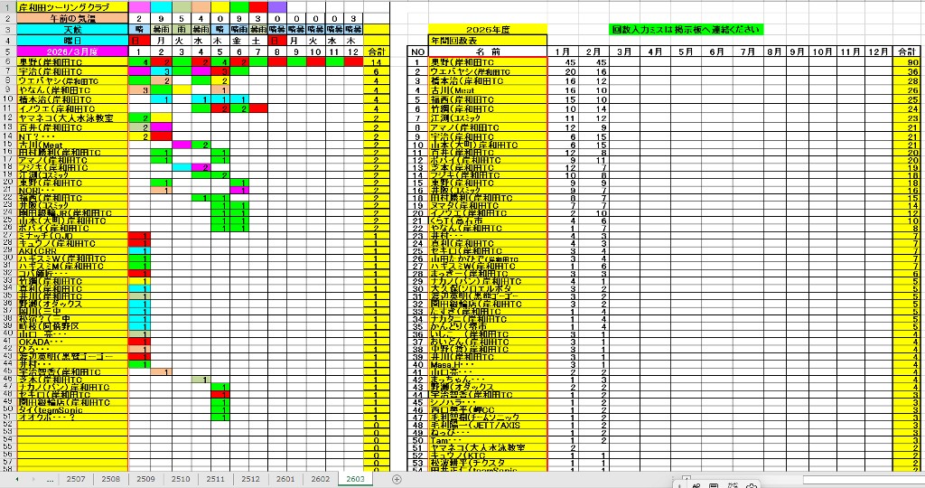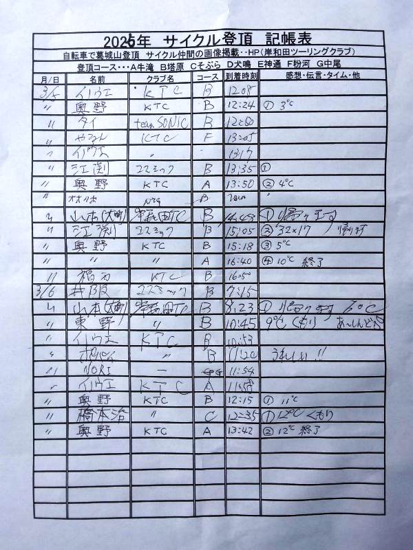 <サイクルの点検、整備、安全に葛城山へ・・上がろう~> <注意・・・落石・枝折れ・倒木・穴ぼこ・落車したら骨折します・> 葛城山の下りは安全運転、油断大敵<車>に注意!・・・・安全第一 ・・葛城山に春の兆し・・5℃~10℃・・・中尾コースで咲いた、しだれ桜? ![]() 2026/02/21 中尾コースの切畑で見つけた、しだれ桜?梅?// UP画像・・・ 2026/三月度 ゆたか茶屋の茶屋の休日カレンダー//UP画像・・ 2026/ 2月度<89人登頂 357回> 奥野ー45//ウエバヤシー16//宇治ー15//山本大町ー15//竹綱ー14// 橋本ー12//江渕ー12//ポパイー11//古川ー10//イノウエー10// 福西ー10//東野ー09//アマノー09//百井ー08//フジキー08// やなんー07//井阪ー07//ヌマター07//田村勝利ー07//芝本ー07// ☆彡あなたの今月登頂回数は・・・☆彡 03月度 回数表 2026/ 3/06~・・・ NO-01 掲示板 記帳表 2026 3月度 3/06~・・・ 24~28 28~3/01 01~02 02~05 05~06・・・ 葛城山登頂 累計回数表 2026/1~02月度 NO-01 NO-02 <今後、単独の鍋谷コースは管理できないので、経由、2本目の葛城山でカウントします。> *掲示板下の写真入れに・・<葛城山のナイスショット画像プレゼント中・・> 掲示板、在庫数量・・<KTCジャージの受付・・窓口、橋本治・ウエバヤシ・> 2025// 1~12月度 年間回数 累計・・・NO-01 NO-02 NO-03 ☆彡 2005~2025まで・・年間 100本以上 葛城山サイクル登頂者 集計ミスは随時訂正・・ NO-01 NO-02 NO-03 NO-04 NO-05 NO-06 NO-07 NO-08 NO-09 NO-10 回数表 2026/02月度 2/01~28・・ NO-01 NO-02 回数表 2026/01月度 1/01~31 NO-01 NO-02 回数表 2025/12月度 01~31日・・・NO-01 NO-02 2025/11月度 01~30日 回数表 NO-01 NO-02 NO-03 2025/10月度 回数表 1~30・・ NO-01 NO-02 NO-03 9月度 回数表 2025/09/01~30・・NO-01 NO-02 NO-03 NO-04 8月度 回数表 2025/08/01~31・・NO-01 NO-02 NO-03 NO-04 7月度回数表 2025/07/01~31・・ NO-01 NO-02 NO-03 NO-04 2025/06/01~30・・・回数表 NO-01 NO-02 NOー03 NO-04 2025 5/01~31・・回数表 NO-01 NO-02 NO-03 NO-04 2025 04/01~30・・回数表 2025・・・NO-01 N0-02 NO-03 NO-04 2025 3/01~31 回数表 NOー01 NO-02 NO-03 NOー04 2025 2/01~28 回数表 NO-01 NO-02 20251/01~31★回数表 NO-01 NO-02 NO-03 2005~2024年まで100回以上・・葛城山へ上がった・累計・・ NO-01 NO-02 NO-03 NOー04 NO-05 NO-06 訂NO-07 NO-08 NO-09 |