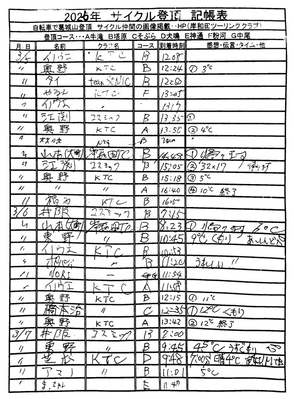 <サイクルの点検、整備、安全に葛城山へ・・上がろう~> <注意・・・落石・枝折れ・倒木・穴ぼこ・落車したら骨折します・> 葛城山の下りは安全運転、油断大敵<車>に注意!・・・・安全第一 ・・葛城山に春の兆し・・5℃~10℃・・・中尾コースで咲いた、しだれ桜? ![]() 2026/02/21 中尾コースの切畑で見つけた、しだれ桜?梅?// UP画像・・・ 2026/三月度 ゆたか茶屋の茶屋の休日カレンダー//UP画像・・ 2026/ 2月度<89人登頂 357回> 奥野ー45//ウエバヤシー16//宇治ー15//山本大町ー15//竹綱ー14// 橋本ー12//江渕ー12//ポパイー11//古川ー10//イノウエー10// 福西ー10//東野ー09//アマノー09//百井ー08//フジキー08// やなんー07//井阪ー07//ヌマター07//田村勝利ー07//芝本ー07// ☆彡あなたの今月登頂回数は・・・☆彡 03月度 回数表 2026/ 3/07~・・・ NO-01 掲示板 記帳表 2026 3月度 3/07~・・・ 24~28 28~3/01 01~02 02~05 05~07 07~・・・ 葛城山登頂 累計回数表 2026/1~02月度 NO-01 NO-02 <今後、単独の鍋谷コースは管理できないので、経由、2本目の葛城山でカウントします。> *掲示板下の写真入れに・・<葛城山のナイスショット画像プレゼント中・・> 掲示板、在庫数量・・<KTCジャージの受付・・窓口、橋本治・ウエバヤシ・> 2025// 1~12月度 年間回数 累計・・・NO-01 NO-02 NO-03 ☆彡 2005~2025まで・・年間 100本以上 葛城山サイクル登頂者 集計ミスは随時訂正・・ NO-01 NO-02 NO-03 NO-04 NO-05 NO-06 NO-07 NO-08 NO-09 NO-10 回数表 2026/02月度 2/01~28・・ NO-01 NO-02 回数表 2026/01月度 1/01~31 NO-01 NO-02 回数表 2025/12月度 01~31日・・・NO-01 NO-02 2025/11月度 01~30日 回数表 NO-01 NO-02 NO-03 2025/10月度 回数表 1~30・・ NO-01 NO-02 NO-03 9月度 回数表 2025/09/01~30・・NO-01 NO-02 NO-03 NO-04 8月度 回数表 2025/08/01~31・・NO-01 NO-02 NO-03 NO-04 7月度回数表 2025/07/01~31・・ NO-01 NO-02 NO-03 NO-04 2025/06/01~30・・・回数表 NO-01 NO-02 NOー03 NO-04 2025 5/01~31・・回数表 NO-01 NO-02 NO-03 NO-04 2025 04/01~30・・回数表 2025・・・NO-01 N0-02 NO-03 NO-04 2025 3/01~31 回数表 NOー01 NO-02 NO-03 NOー04 2025 2/01~28 回数表 NO-01 NO-02 20251/01~31★回数表 NO-01 NO-02 NO-03 2005~2024年まで100回以上・・葛城山へ上がった・累計・・ NO-01 NO-02 NO-03 NOー04 NO-05 NO-06 訂NO-07 NO-08 NO-09 |