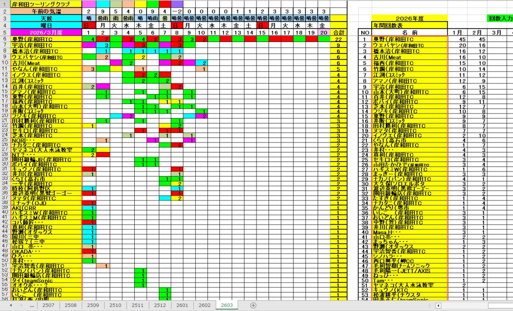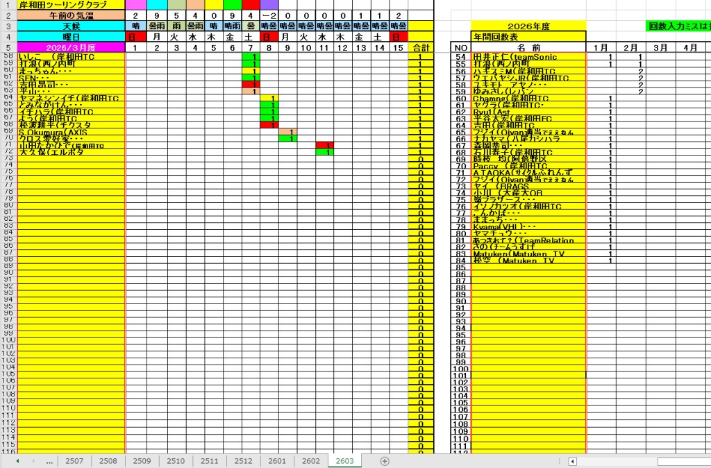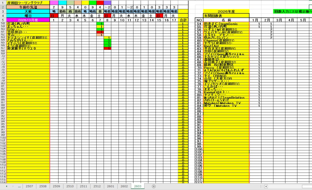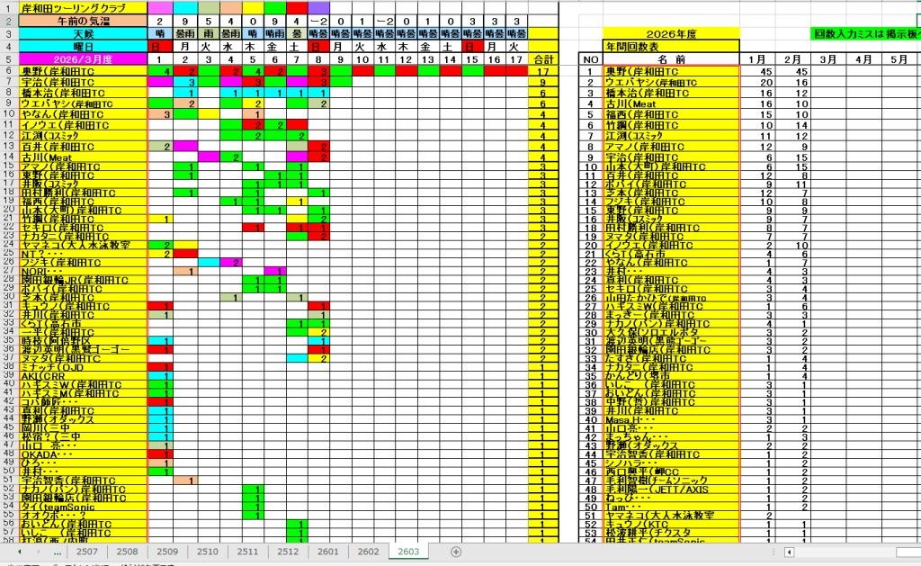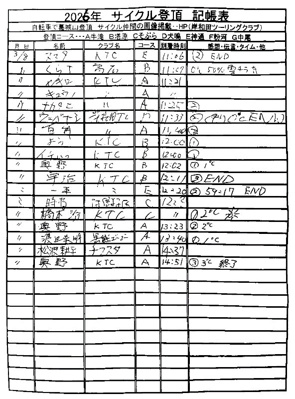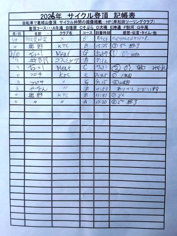 <サイクルの点検、整備、安全に葛城山へ・・上がろう~> <注意・・・落石・枝折れ・倒木・穴ぼこ・落車したら骨折します・> 葛城山の下りは安全運転、油断大敵<車>に注意!・・・・安全第一 ・・葛城山に春の兆し・・5℃~10℃・・・中尾コースで咲いた、しだれ桜? ![]() 2026/02/21 中尾コースの切畑で見つけた、しだれ桜?梅?// UP画像・・・ 2026/三月度 ゆたか茶屋の茶屋の休日カレンダー//UP画像・・ 2026/ 2月度<89人登頂 357回> 奥野ー45//ウエバヤシー16//宇治ー15//山本大町ー15//竹綱ー14// 橋本ー12//江渕ー12//ポパイー11//古川ー10//イノウエー10// 福西ー10//東野ー09//アマノー09//百井ー08//フジキー08// やなんー07//井阪ー07//ヌマター07//田村勝利ー07//芝本ー07// ☆彡あなたの今月登頂回数は・・・☆彡 03月度 回数表 2026/ 3/09~・・・ NO-01 NO-02 掲示板 記帳表 2026 3月度 3/09~・・・ 24~28 28~3/01 01~02 02~05 05~07 07~08 08~09 09~・・・ 葛城山登頂 累計回数表 2026/1~02月度 NO-01 NO-02 <今後、単独の鍋谷コースは管理できないので、経由、2本目の葛城山でカウントします。> *掲示板下の写真入れに・・<葛城山のナイスショット画像プレゼント中・・> 掲示板、在庫数量・・<KTCジャージの受付・・窓口、橋本治・ウエバヤシ・> 2025// 1~12月度 年間回数 累計・・・NO-01 NO-02 NO-03 ☆彡 2005~2025まで・・年間 100本以上 葛城山サイクル登頂者 集計ミスは随時訂正・・ NO-01 NO-02 NO-03 NO-04 NO-05 NO-06 NO-07 NO-08 NO-09 NO-10 回数表 2026/02月度 2/01~28・・ NO-01 NO-02 回数表 2026/01月度 1/01~31 NO-01 NO-02 回数表 2025/12月度 01~31日・・・NO-01 NO-02 2025/11月度 01~30日 回数表 NO-01 NO-02 NO-03 2025/10月度 回数表 1~30・・ NO-01 NO-02 NO-03 9月度 回数表 2025/09/01~30・・NO-01 NO-02 NO-03 NO-04 8月度 回数表 2025/08/01~31・・NO-01 NO-02 NO-03 NO-04 7月度回数表 2025/07/01~31・・ NO-01 NO-02 NO-03 NO-04 2025/06/01~30・・・回数表 NO-01 NO-02 NOー03 NO-04 2025 5/01~31・・回数表 NO-01 NO-02 NO-03 NO-04 2025 04/01~30・・回数表 2025・・・NO-01 N0-02 NO-03 NO-04 2025 3/01~31 回数表 NOー01 NO-02 NO-03 NOー04 2025 2/01~28 回数表 NO-01 NO-02 20251/01~31★回数表 NO-01 NO-02 NO-03 2005~2024年まで100回以上・・葛城山へ上がった・累計・・ NO-01 NO-02 NO-03 NOー04 NO-05 NO-06 訂NO-07 NO-08 NO-09 |