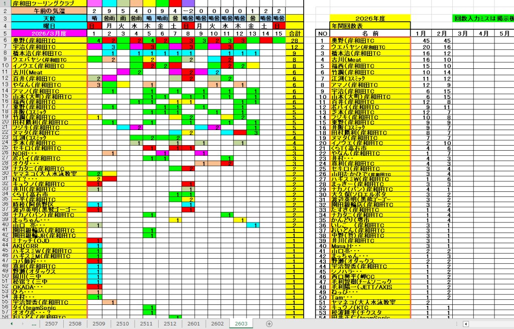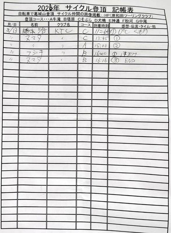 <サイクルの点検、整備、安全に葛城山へ・・上がろう~> <注意・・・落石・枝折れ・倒木・穴ぼこ・落車したら骨折します・> 葛城山の下りは安全運転、油断大敵<車>に注意!・・・・安全第一 2026/三月度 23-24-25日臨時休業// ゆたか茶屋の茶屋の休日カレンダー 2026/ 2月度<89人登頂 357回> 奥野ー45//ウエバヤシー16//宇治ー15//山本大町ー15//竹綱ー14// 橋本ー12//江渕ー12//ポパイー11//古川ー10//イノウエー10// 福西ー10//東野ー09//アマノー09//百井ー08//フジキー08// やなんー07//井阪ー07//ヌマター07//田村勝利ー07//芝本ー07// ☆彡あなたの今月登頂回数目標は?・・・☆彡 追加 03月度 回数表 2026/ 3/13~・・・ NO-01 NO-02 掲示板 記帳表 2026 3月度 3/13~・・・ 24~28 28~3/01 01~02 02~05 05~07 07~08 08~09 09~11 11~13 13~・・・ 葛城山登頂 累計回数表 2026/1~02月度 NO-01 NO-02 <今後、単独の鍋谷コースは管理できないので、経由、2本目の葛城山でカウントします。> *掲示板下の写真入れに・・<葛城山のナイスショット画像プレゼント中・・> 掲示板、在庫数量・・<KTCジャージの受付・・窓口、橋本治・ウエバヤシ・> 2025// 1~12月度 年間回数 累計・・・NO-01 NO-02 NO-03 ☆彡 2005~2025まで・・年間 100本以上 葛城山サイクル登頂者 集計ミスは随時訂正・・ NO-01 NO-02 NO-03 NO-04 NO-05 NO-06 NO-07 NO-08 NO-09 NO-10 回数表 2026/02月度 2/01~28・・ NO-01 NO-02 回数表 2026/01月度 1/01~31 NO-01 NO-02 回数表 2025/12月度 01~31日・・・NO-01 NO-02 2025/11月度 01~30日 回数表 NO-01 NO-02 NO-03 2025/10月度 回数表 1~30・・ NO-01 NO-02 NO-03 9月度 回数表 2025/09/01~30・・NO-01 NO-02 NO-03 NO-04 8月度 回数表 2025/08/01~31・・NO-01 NO-02 NO-03 NO-04 7月度回数表 2025/07/01~31・・ NO-01 NO-02 NO-03 NO-04 2025/06/01~30・・・回数表 NO-01 NO-02 NOー03 NO-04 2025 5/01~31・・回数表 NO-01 NO-02 NO-03 NO-04 2025 04/01~30・・回数表 2025・・・NO-01 N0-02 NO-03 NO-04 2025 3/01~31 回数表 NOー01 NO-02 NO-03 NOー04 2025 2/01~28 回数表 NO-01 NO-02 20251/01~31★回数表 NO-01 NO-02 NO-03 2005~2024年まで100回以上・・葛城山へ上がった・累計・・ NO-01 NO-02 NO-03 NOー04 NO-05 NO-06 訂NO-07 NO-08 NO-09 |
