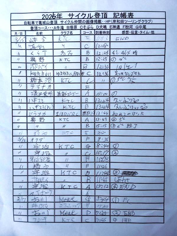 <サイクルの点検、整備、安全に葛城山へ・・上がろう~> <注意・・・落石・枝折れ・倒木・穴ぼこ・落車したら骨折します・> 葛城山の下りは安全運転、油断大敵<車>に注意!・・・・安全第一 ![]() 2026/03/19 (和泉市「若樫の百滝桜」)// 橋本治さん撮影・・UP画像・・・ 2026/三月度 23-24-25日臨時休業// ゆたか茶屋の茶屋の休日カレンダー 2026/ 2月度<89人登頂 357回> 奥野ー45//ウエバヤシー16//宇治ー15//山本大町ー15//竹綱ー14// 橋本ー12//江渕ー12//ポパイー11//古川ー10//イノウエー10// 福西ー10//東野ー09//アマノー09//百井ー08//フジキー08// やなんー07//井阪ー07//ヌマター07//田村勝利ー07//芝本ー07// ☆彡あなたの今月登頂回数目標は?・・・☆彡 3月度 回数表 2026/ 3/18~・・・ NO-01 NO-02 掲示板 記帳表 2026 3月度 3/18~・・・ 24~28 28~3/01 01~02 02~05 05~07 07~08 08~09 09~11 11~13 13~14 14~15 15~17 17~18・・・ 葛城山登頂 累計回数表 2026/1~02月度 NO-01 NO-02 <今後、単独の鍋谷コースは管理できないので、経由、2本目の葛城山でカウントします。> *掲示板下の写真入れに・・<葛城山のナイスショット画像プレゼント中・・> 掲示板、在庫数量・・<KTCジャージの受付・・窓口、橋本治・ウエバヤシ・> 2025// 1~12月度 年間回数 累計・・・NO-01 NO-02 NO-03 ☆彡 2005~2025まで・・年間 100本以上 葛城山サイクル登頂者 集計ミスは随時訂正・・ NO-01 NO-02 NO-03 NO-04 NO-05 NO-06 NO-07 NO-08 NO-09 NO-10 回数表 2026/02月度 2/01~28・・ NO-01 NO-02 回数表 2026/01月度 1/01~31 NO-01 NO-02 回数表 2025/12月度 01~31日・・・NO-01 NO-02 2025/11月度 01~30日 回数表 NO-01 NO-02 NO-03 2025/10月度 回数表 1~30・・ NO-01 NO-02 NO-03 9月度 回数表 2025/09/01~30・・NO-01 NO-02 NO-03 NO-04 8月度 回数表 2025/08/01~31・・NO-01 NO-02 NO-03 NO-04 7月度回数表 2025/07/01~31・・ NO-01 NO-02 NO-03 NO-04 2025/06/01~30・・・回数表 NO-01 NO-02 NOー03 NO-04 2025 5/01~31・・回数表 NO-01 NO-02 NO-03 NO-04 2025 04/01~30・・回数表 2025・・・NO-01 N0-02 NO-03 NO-04 2025 3/01~31 回数表 NOー01 NO-02 NO-03 NOー04 2025 2/01~28 回数表 NO-01 NO-02 20251/01~31★回数表 NO-01 NO-02 NO-03 2005~2024年まで100回以上・・葛城山へ上がった・累計・・ NO-01 NO-02 NO-03 NOー04 NO-05 NO-06 訂NO-07 NO-08 NO-09 |