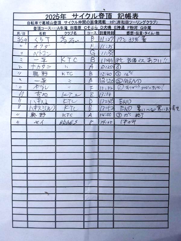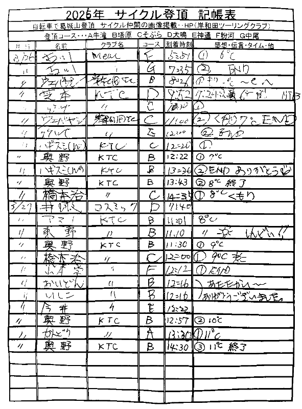 (参考)<牛滝コース通行止め <2023/12/01開通・・> 2023/03/19 オオタニ(10葛G他) 4/01 たすき(7葛) 4/09 たすき(7葛) 4/11 ウエダ(7葛) 4/13 ハギスミ(7葛) 4/16 たすき(7葛) 4/23 たすき(7葛) 5/01 たすき(7葛) 5/05 たすき(7葛) スエシン(8葛) 5/21 BANchan(7葛) 5/28 たすき(8葛) 小橋紀彦(7葛) 6/04 たすき(8葛) 6/07 よう(7葛) 6/10 たすき(9葛) 奥野(B7葛) 6/18 たすき(9葛) 6/25 たすき(10葛!) 7/02 たすき(9葛) 奥野(B7葛) 7/15 奥野(B7葛) 8/06 奥野(B7葛) 8/11 オンダ(7葛) 8/12 奥野(B7葛) 8/13 たすき(7葛) 8/20 たすき(7葛) 8/27 たすき(7葛) 9/02 奥野(B7葛) 9/24 たすき(7葛) 10/10 フジキ(7葛) 10/15 たすき(7葛) 10/21 たすき(7葛) 10/29 たすき(7葛) 11/05 たすき(8葛) 11/12 たすき(7葛) 11/19 たすき(堺)8葛 11/26 たすき(堺)8葛 12/03 たすき(堺)8葛 12/14 井原(7葛) 12/18 平谷太宏(B7葛) 7葛(A-B-C-D-E-F-G)// (単)コース7本以上) 2022/04/05 オオタニ(7葛) 4/23 ミツ(7葛) 川セ(7葛) 4/28 かきはら(7葛) 5/02 BANCHAN(7葛) 5/15 BANCHAN(7葛) 5/18 イチハラ(7葛) 5/24 Kanamori(7葛) 5/25 スエシン(7葛) 5/29 Okumura(C7葛) 6/03 カツ(7葛) 6/10 松波耕平さん(7葛) 6/10 橋本 治(C7葛) 6/12 エガワ(7葛) 6/19 オオタニ(D1・G7/8葛) 7/06 くまたに(8葛) 7/9 K.Nagno(B7葛) 8/01 くまたに(9葛) 8/10 くまたに(7葛) 8/16 BANCHAN(7葛) 8/25 スズキオサム(7葛) 12/08 井原(7葛) |