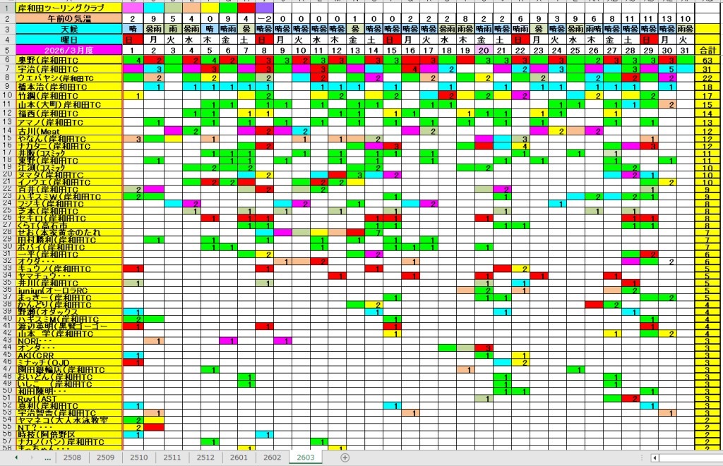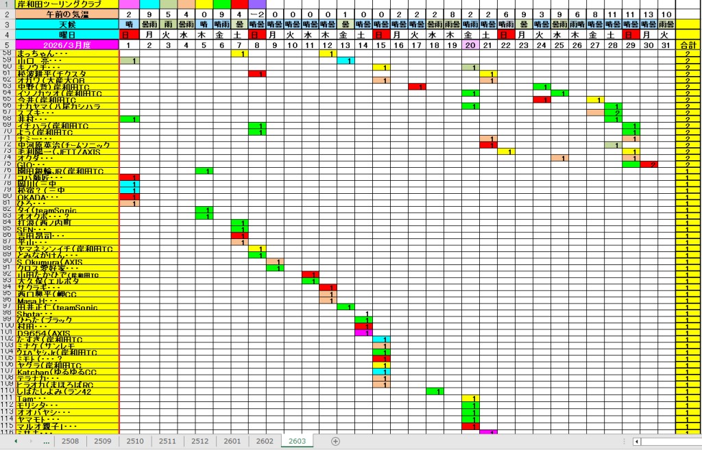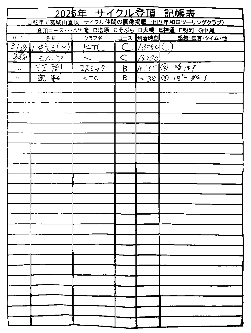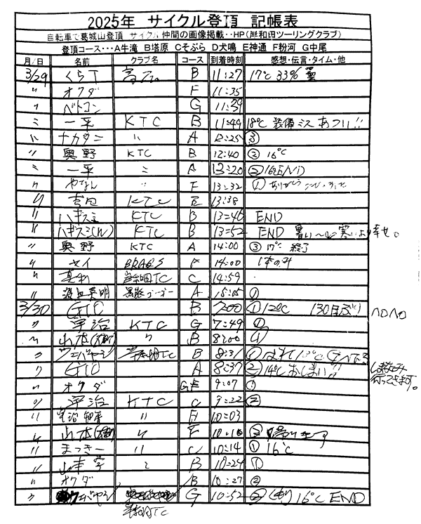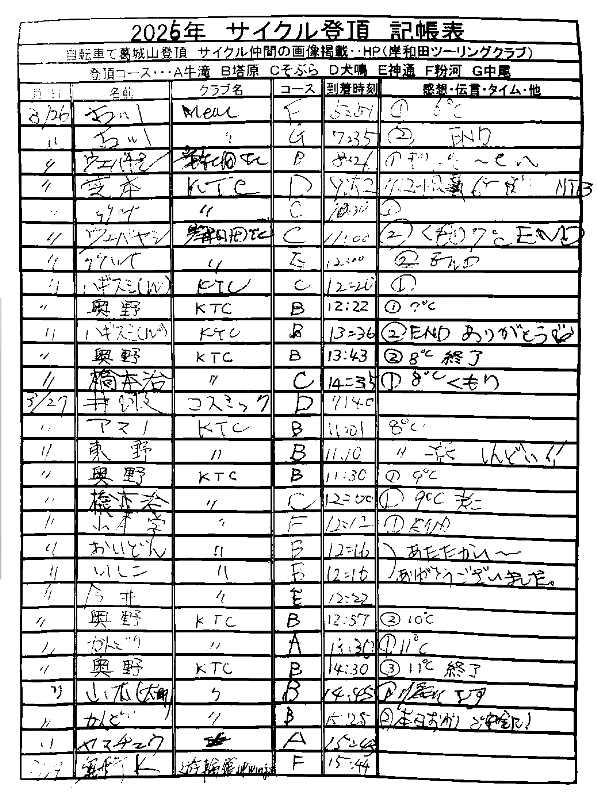 <サイクルの点検、整備、安全に葛城山へ・・上がろう~> <注意・・・落石・枝折れ・倒木・穴ぼこ・落車したら骨折します・> 葛城山の下りは安全運転、油断大敵<車>に注意!・・・・安全第一 ![]() ![]() 2026/03/30 塔原バス停前のサクラ満開!・・// UP画像・・・ 2026/03/30 相川辺りのサクラ風景・・// 相徳庵のサクラ・・・UP画像・・・ 2026/03/30 中尾コースのさくら・・・満開!// さくら並木・・・満開! UP画像・・・ ![]() 塔原墓地の大桜・開花・・// 父鬼山の桜・・// しだれ桜和泉若樫町 百滝枝垂れ桜 2026/ 2月度<89人登頂 357回> 奥野ー45//ウエバヤシー16//宇治ー15//山本大町ー15//竹綱ー14// 橋本ー12//江渕ー12//ポパイー11//古川ー10//イノウエー10// 福西ー10//東野ー09//アマノー09//百井ー08//フジキー08// やなんー07//井阪ー07//ヌマター07//田村勝利ー07//芝本ー07// ☆彡あなたの今月登頂回数目標は?・・・☆彡 暫定 3月度 回数表 2026/ 3/30~・・・NO-01 NO-02 NO-03 掲示板 記帳表 2026 3月度 3/30・・・暫定 24~28 28~3/01 01~02 02~05 05~07 07~08 08~09 09~11 11~13 13~14 14~15 15~17 17~20 20~21 21~22 22~23 23~26 26~27 27~28 28~29 29~30 30~・・・ 葛城山登頂 累計回数表 2026/1~02月度 NO-01 NO-02 <単独の鍋谷コースは管理できないので、経由、2本目の葛城山でカウントします。> *掲示板下の写真入れに・・<葛城山のナイスショット画像プレゼント中・・> 掲示板、在庫数量・・<KTCジャージの受付・・窓口、橋本治・ウエバヤシ・> 2025// 1~12月度 年間回数 累計・・・NO-01 NO-02 NO-03 ☆彡 2005~2025まで・・年間 100本以上 葛城山サイクル登頂者 集計ミスは随時訂正・・ NO-01 NO-02 NO-03 NO-04 NO-05 NO-06 NO-07 NO-08 NO-09 NO-10 回数表 2026/02月度 2/01~28・・ NO-01 NO-02 回数表 2026/01月度 1/01~31 NO-01 NO-02 回数表 2025/12月度 01~31日・・・NO-01 NO-02 2025/11月度 01~30日 回数表 NO-01 NO-02 NO-03 2025/10月度 回数表 1~30・・ NO-01 NO-02 NO-03 9月度 回数表 2025/09/01~30・・NO-01 NO-02 NO-03 NO-04 8月度 回数表 2025/08/01~31・・NO-01 NO-02 NO-03 NO-04 7月度回数表 2025/07/01~31・・ NO-01 NO-02 NO-03 NO-04 2025/06/01~30・・・回数表 NO-01 NO-02 NOー03 NO-04 2025 5/01~31・・回数表 NO-01 NO-02 NO-03 NO-04 2025 04/01~30・・回数表 2025・・・NO-01 N0-02 NO-03 NO-04 2025 3/01~31 回数表 NOー01 NO-02 NO-03 NOー04 2025 2/01~28 回数表 NO-01 NO-02 20251/01~31★回数表 NO-01 NO-02 NO-03 2005~2024年まで100回以上・・葛城山へ上がった・累計・・ NO-01 NO-02 NO-03 NOー04 NO-05 NO-06 訂NO-07 NO-08 NO-09 |