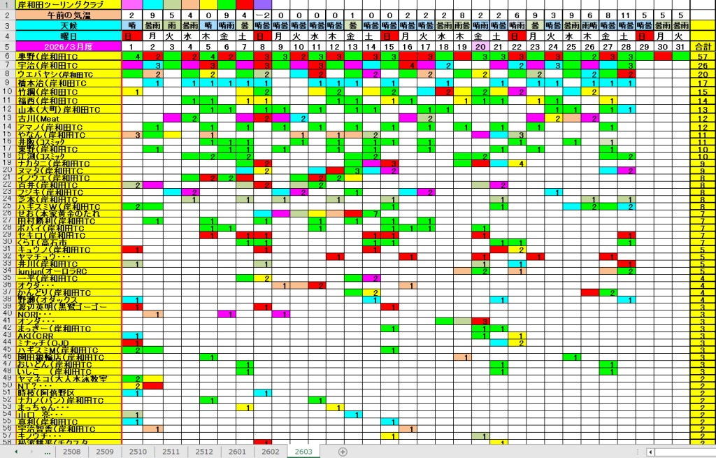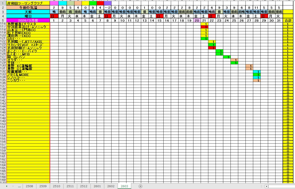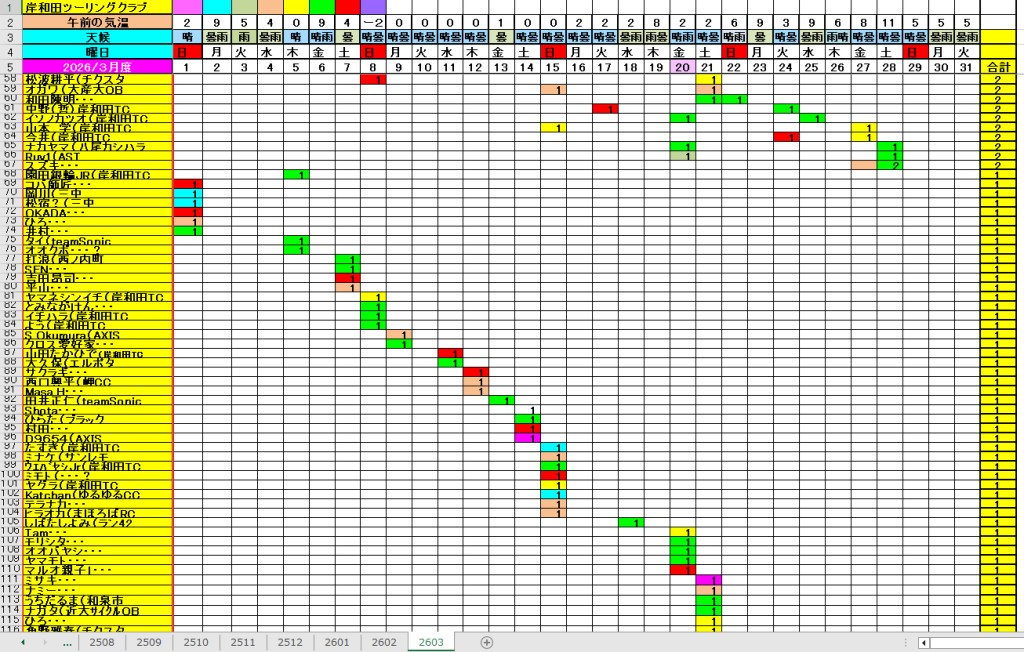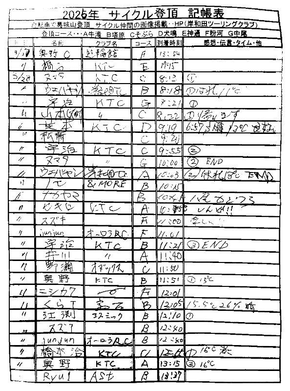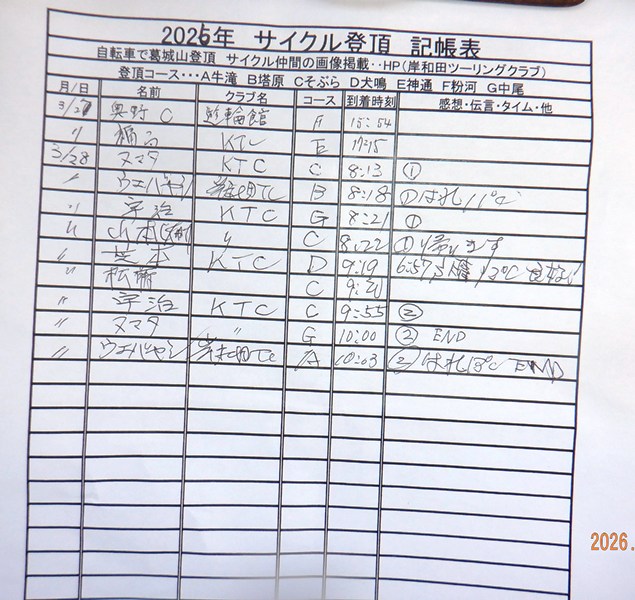 <サイクルの点検、整備、安全に葛城山へ・・上がろう~> <注意・・・落石・枝折れ・倒木・穴ぼこ・落車したら骨折します・> 葛城山の下りは安全運転、油断大敵<車>に注意!・・・・安全第一 2026/03/28 河合交差点のピンクの桜がキレイ!・・// UP画像・・・ 2026/03/26 葛城山・ゆたか茶屋から大阪万博付近 眺望// 昨年、4/13 開幕~UP画像 2026/三月度 23-24-25日臨時休業// ゆたか茶屋の茶屋の休日カレンダー 2026/ 2月度<89人登頂 357回> 奥野ー45//ウエバヤシー16//宇治ー15//山本大町ー15//竹綱ー14// 橋本ー12//江渕ー12//ポパイー11//古川ー10//イノウエー10// 福西ー10//東野ー09//アマノー09//百井ー08//フジキー08// やなんー07//井阪ー07//ヌマター07//田村勝利ー07//芝本ー07// ☆彡あなたの今月登頂回数目標は?・・・☆彡 3月度 回数表 2026/ 3/28~・・・ NO-01 NO-02 NO-03 掲示板 記帳表 2026 3月度 3/28・・・ 24~28 28~3/01 01~02 02~05 05~07 07~08 08~09 09~11 11~13 13~14 14~15 15~17 17~20 20~21 21~22 22~23 23~26 26~27 27~28 28~・・・ 葛城山登頂 累計回数表 2026/1~02月度 NO-01 NO-02 <単独の鍋谷コースは管理できないので、経由、2本目の葛城山でカウントします。> *掲示板下の写真入れに・・<葛城山のナイスショット画像プレゼント中・・> 掲示板、在庫数量・・<KTCジャージの受付・・窓口、橋本治・ウエバヤシ・> 2025// 1~12月度 年間回数 累計・・・NO-01 NO-02 NO-03 ☆彡 2005~2025まで・・年間 100本以上 葛城山サイクル登頂者 集計ミスは随時訂正・・ NO-01 NO-02 NO-03 NO-04 NO-05 NO-06 NO-07 NO-08 NO-09 NO-10 回数表 2026/02月度 2/01~28・・ NO-01 NO-02 回数表 2026/01月度 1/01~31 NO-01 NO-02 回数表 2025/12月度 01~31日・・・NO-01 NO-02 2025/11月度 01~30日 回数表 NO-01 NO-02 NO-03 2025/10月度 回数表 1~30・・ NO-01 NO-02 NO-03 9月度 回数表 2025/09/01~30・・NO-01 NO-02 NO-03 NO-04 8月度 回数表 2025/08/01~31・・NO-01 NO-02 NO-03 NO-04 7月度回数表 2025/07/01~31・・ NO-01 NO-02 NO-03 NO-04 2025/06/01~30・・・回数表 NO-01 NO-02 NOー03 NO-04 2025 5/01~31・・回数表 NO-01 NO-02 NO-03 NO-04 2025 04/01~30・・回数表 2025・・・NO-01 N0-02 NO-03 NO-04 2025 3/01~31 回数表 NOー01 NO-02 NO-03 NOー04 2025 2/01~28 回数表 NO-01 NO-02 20251/01~31★回数表 NO-01 NO-02 NO-03 2005~2024年まで100回以上・・葛城山へ上がった・累計・・ NO-01 NO-02 NO-03 NOー04 NO-05 NO-06 訂NO-07 NO-08 NO-09 |