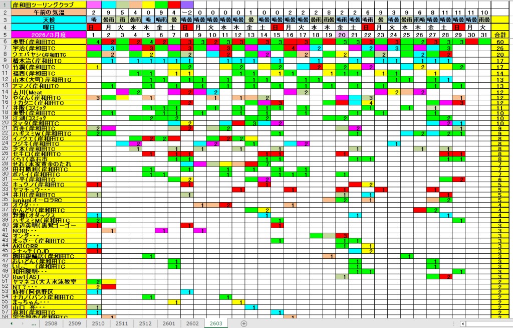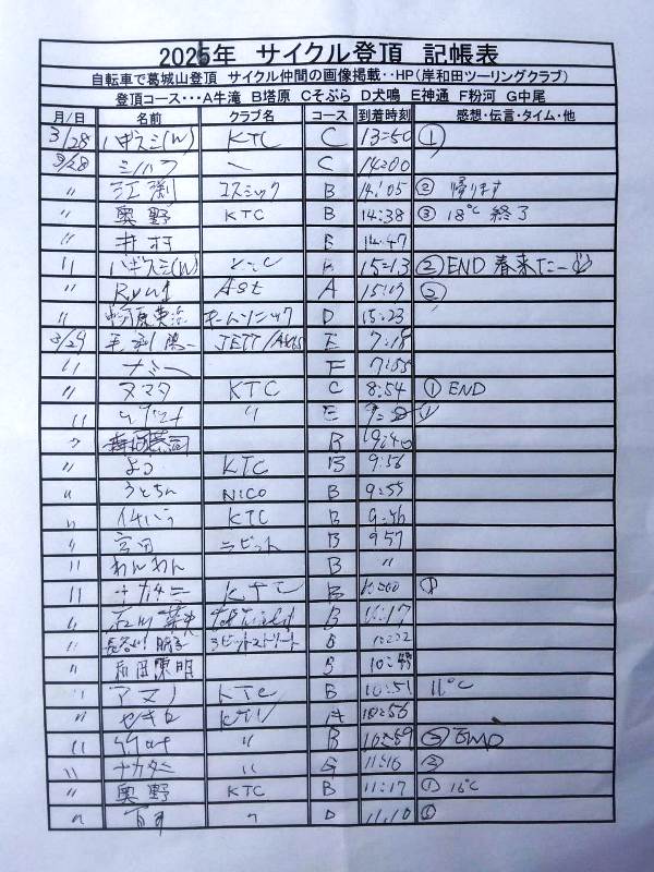 <サイクルの点検、整備、安全に葛城山へ・・上がろう~> <注意・・・落石・枝折れ・倒木・穴ぼこ・落車したら骨折します・> 葛城山の下りは安全運転、油断大敵<車>に注意!・・・・安全第一 和泉若樫町、百滝枝垂れ桜(満開)・・・さくら・桜・サクラ・・ 2026/03/30 しだれ桜 3/29 しだれ桜 ![]() 包近の桃の花・・・・・// 山の桜・・// 近所の桜 2026/03/28 河合交差点のピンクの桜がキレイ!・・// UP画像・・・ 2026/三月度 23-24-25日臨時休業// ゆたか茶屋の茶屋の休日カレンダー 2026/03/26 ゆたか茶屋から懐かしい大阪万博跡 眺望・・//昨年4/13 開幕~UP画像 2026/ 2月度<89人登頂 357回> 奥野ー45//ウエバヤシー16//宇治ー15//山本大町ー15//竹綱ー14// 橋本ー12//江渕ー12//ポパイー11//古川ー10//イノウエー10// 福西ー10//東野ー09//アマノー09//百井ー08//フジキー08// やなんー07//井阪ー07//ヌマター07//田村勝利ー07//芝本ー07// ☆彡あなたの今月登頂回数目標は?・・・☆彡 3月度 回数表 2026/ 3/29~・・・NO-01 NO-02 NO-03 掲示板 記帳表 2026 3月度 3/29・・・ 24~28 28~3/01 01~02 02~05 05~07 07~08 08~09 09~11 11~13 13~14 14~15 15~17 17~20 20~21 21~22 22~23 23~26 26~27 27~28 28~29 29~・・・ 葛城山登頂 累計回数表 2026/1~02月度 NO-01 NO-02 <単独の鍋谷コースは管理できないので、経由、2本目の葛城山でカウントします。> *掲示板下の写真入れに・・<葛城山のナイスショット画像プレゼント中・・> 掲示板、在庫数量・・<KTCジャージの受付・・窓口、橋本治・ウエバヤシ・> 2025// 1~12月度 年間回数 累計・・・NO-01 NO-02 NO-03 ☆彡 2005~2025まで・・年間 100本以上 葛城山サイクル登頂者 集計ミスは随時訂正・・ NO-01 NO-02 NO-03 NO-04 NO-05 NO-06 NO-07 NO-08 NO-09 NO-10 回数表 2026/02月度 2/01~28・・ NO-01 NO-02 回数表 2026/01月度 1/01~31 NO-01 NO-02 回数表 2025/12月度 01~31日・・・NO-01 NO-02 2025/11月度 01~30日 回数表 NO-01 NO-02 NO-03 2025/10月度 回数表 1~30・・ NO-01 NO-02 NO-03 9月度 回数表 2025/09/01~30・・NO-01 NO-02 NO-03 NO-04 8月度 回数表 2025/08/01~31・・NO-01 NO-02 NO-03 NO-04 7月度回数表 2025/07/01~31・・ NO-01 NO-02 NO-03 NO-04 2025/06/01~30・・・回数表 NO-01 NO-02 NOー03 NO-04 2025 5/01~31・・回数表 NO-01 NO-02 NO-03 NO-04 2025 04/01~30・・回数表 2025・・・NO-01 N0-02 NO-03 NO-04 2025 3/01~31 回数表 NOー01 NO-02 NO-03 NOー04 2025 2/01~28 回数表 NO-01 NO-02 20251/01~31★回数表 NO-01 NO-02 NO-03 2005~2024年まで100回以上・・葛城山へ上がった・累計・・ NO-01 NO-02 NO-03 NOー04 NO-05 NO-06 訂NO-07 NO-08 NO-09 |