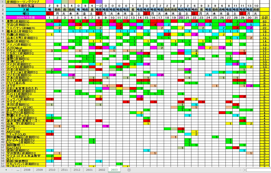 <サイクルの点検、整備、安全に葛城山へ・・上がろう~> <注意・・・落石・枝折れ・倒木・穴ぼこ・落車したら骨折します・> 葛城山の下りは安全運転、油断大敵<車>に注意!・・・・安全第一 2026/04/020 塔原墓地の大桜・満開!!・・// UP画像・・ 2026/04/02 塔原バス停前のサクラ満開// UP画像・・・・ 2026/04/02 塔原コースに見つけた白い花?// モクレンの花かな?UP画像・・・・ ![]() 2026/03/31 フジキさん撮影、中尾コースのさくら・満開!//さくら並木がキレイ! UP画像 2026/03/30 中尾コースのさくら・・・満開!// さくら並木・・・満開! UP画像・・・ 葛城山粉河ハイランド ゆたか茶屋の4月度 休日カレンダー・・ 父鬼山の桜・・// しだれ桜和泉若樫町 百滝枝垂れ桜 ☆彡4月葛城山登頂、回数目標は?・・・☆彡 4月度 回数表 2026/ 4/02~・・NO-01 NO-02 NO-03 2026/ 3月度<140人登頂 560回> 奥野ー63//宇治ー31//ウエバヤシー22//橋本ー18//竹綱ー17// 山本大町ー15//福西ー14//アマノー13// 古川ー12//やなんー12//ナカタニー12//井阪ー11//東野ー11// フジキー10//江渕ー10//ヌマター10//イノウエー10//百井ー09// ハギスミWー09//芝本ー08//セキ口ー08//くらT-08//オクダー08// せおー07//田村勝利ー07//ポパイー07// ☆彡あなたの今月登頂回数目標は?・・・☆彡 3月度 回数表 2026/ 3/30~・・・NO-01 NO-02 NO-03 掲示板 記帳表 2026 4月度 4/02・・ 27~28 28~29 29~30 30~4/02 02~・・・ 追加 2026/1~03月度 葛城山登頂 累計回数表 NO-01 NO-02 <単独の鍋谷コースは管理できないので、経由、2本目の葛城山でカウントします。> *掲示板下の写真入れに・・<葛城山のナイスショット画像プレゼント中・・> 掲示板、在庫数量・・<KTCジャージの受付・・窓口、橋本治・ウエバヤシ・> 2025// 1~12月度 年間回数 累計・・・NO-01 NO-02 NO-03 ☆彡 2005~2025まで・・年間 100本以上 葛城山サイクル登頂者 集計ミスは随時訂正・・ NO-01 NO-02 NO-03 NO-04 NO-05 NO-06 NO-07 NO-08 NO-09 NO-10 回数表 2026/02月度 2/01~28・・ NO-01 NO-02 回数表 2026/01月度 1/01~31 NO-01 NO-02 回数表 2025/12月度 01~31日・・・NO-01 NO-02 2025/11月度 01~30日 回数表 NO-01 NO-02 NO-03 2025/10月度 回数表 1~30・・ NO-01 NO-02 NO-03 9月度 回数表 2025/09/01~30・・NO-01 NO-02 NO-03 NO-04 8月度 回数表 2025/08/01~31・・NO-01 NO-02 NO-03 NO-04 7月度回数表 2025/07/01~31・・ NO-01 NO-02 NO-03 NO-04 2025/06/01~30・・・回数表 NO-01 NO-02 NOー03 NO-04 2025 5/01~31・・回数表 NO-01 NO-02 NO-03 NO-04 2025 04/01~30・・回数表 2025・・・NO-01 N0-02 NO-03 NO-04 2025 3/01~31 回数表 NOー01 NO-02 NO-03 NOー04 2025 2/01~28 回数表 NO-01 NO-02 20251/01~31★回数表 NO-01 NO-02 NO-03 2005~2024年まで100回以上・・葛城山へ上がった・累計・・ NO-01 NO-02 NO-03 NOー04 NO-05 NO-06 訂NO-07 NO-08 NO-09 |