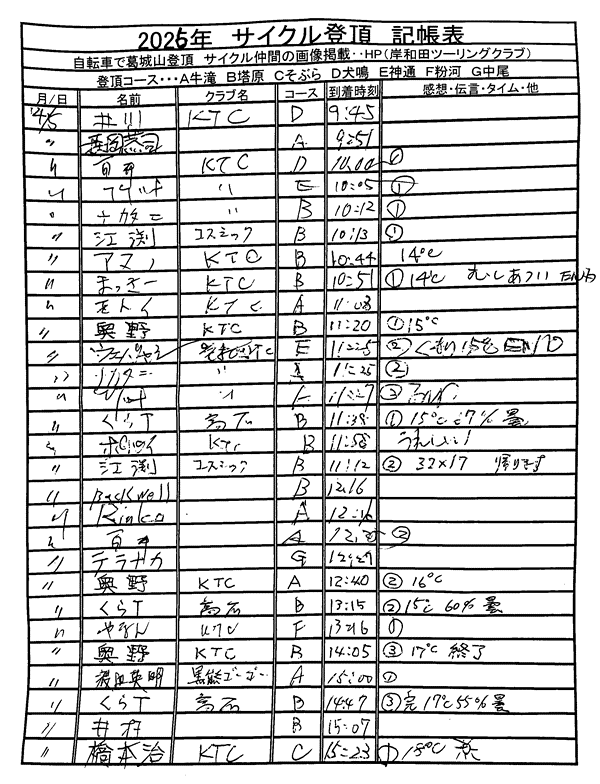 <サイクルの点検、整備、安全に葛城山へ・・上がろう~> <注意・・・落石・枝折れ・倒木・穴ぼこ・落車したら骨折します・> 葛城山の下りは安全運転、油断大敵<車>に注意!・・・・安全第一 ![]() ![]() 2026/04/09 春雨の甲子園球場・・// 勝利のジェット風船・・・・UP画像・・ 2026/04/08 塔原コースから見る、山桜風景・・// UP画像・・・・ 2026/04/08 葛城山に咲いた山ツツジ・・// 季節の花がアピール・・ UP画像・・・・ 2026/04/08 葛城山で訓練のヘリコプター・・// 大阪湾眺望・・昨年万博開催・・ 2026/04/05 神通コースの上り口に咲くキレイな花・・// 花桃の花かな? UP画像・・・ 葛城山粉河ハイランド ゆたか茶屋の4月度 休日カレンダー・・ ☆彡4月葛城山登頂、回数目標は?・・・☆彡 追加4月度 回数表 2026/ 4/08~・・NO-01 NO-02 NO-03 2026/ 3月度<140人登頂 560回> 奥野ー63//宇治ー31//ウエバヤシー22//橋本ー18//竹綱ー17// 山本大町ー15//福西ー14//アマノー13// 古川ー12//やなんー12//ナカタニー12//井阪ー11//東野ー11// フジキー10//江渕ー10//ヌマター10//イノウエー10//百井ー09// ハギスミWー09//芝本ー08//セキ口ー08//くらT-08//オクダー08// せおー07//田村勝利ー07//ポパイー07// ☆彡あなたの今月登頂回数目標は?・・・☆彡 3月度 回数表 2026/ 3/30~・・・NO-01 NO-02 NO-03 掲示板 記帳表 2026 4月度 4/08・・ 27~28 28~29 29~30 30~4/02 02~05 05~08 08~・・・ 追加 2026/1~03月度 葛城山登頂 累計回数表 NO-01 NO-02 <単独の鍋谷コースは管理できないので、経由、2本目の葛城山でカウントします。> *掲示板下の写真入れに・・<葛城山のナイスショット画像プレゼント中・・> 掲示板、在庫数量・・<KTCジャージの受付・・窓口、橋本治・ウエバヤシ・> 2025// 1~12月度 年間回数 累計・・・NO-01 NO-02 NO-03 ☆彡 2005~2025まで・・年間 100本以上 葛城山サイクル登頂者 集計ミスは随時訂正・・ NO-01 NO-02 NO-03 NO-04 NO-05 NO-06 NO-07 NO-08 NO-09 NO-10 回数表 2026/02月度 2/01~28・・ NO-01 NO-02 回数表 2026/01月度 1/01~31 NO-01 NO-02 回数表 2025/12月度 01~31日・・・NO-01 NO-02 2025/11月度 01~30日 回数表 NO-01 NO-02 NO-03 2025/10月度 回数表 1~30・・ NO-01 NO-02 NO-03 9月度 回数表 2025/09/01~30・・NO-01 NO-02 NO-03 NO-04 8月度 回数表 2025/08/01~31・・NO-01 NO-02 NO-03 NO-04 7月度回数表 2025/07/01~31・・ NO-01 NO-02 NO-03 NO-04 2025/06/01~30・・・回数表 NO-01 NO-02 NOー03 NO-04 2025 5/01~31・・回数表 NO-01 NO-02 NO-03 NO-04 2025 04/01~30・・回数表 2025・・・NO-01 N0-02 NO-03 NO-04 2025 3/01~31 回数表 NOー01 NO-02 NO-03 NOー04 2025 2/01~28 回数表 NO-01 NO-02 20251/01~31★回数表 NO-01 NO-02 NO-03 2005~2024年まで100回以上・・葛城山へ上がった・累計・・ NO-01 NO-02 NO-03 NOー04 NO-05 NO-06 訂NO-07 NO-08 NO-09 |