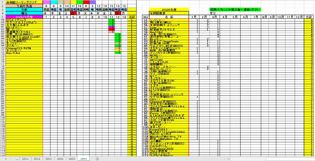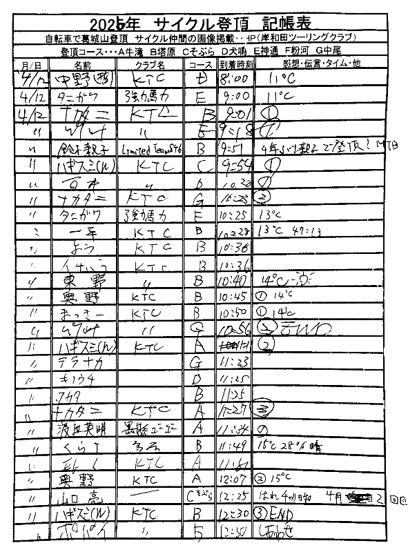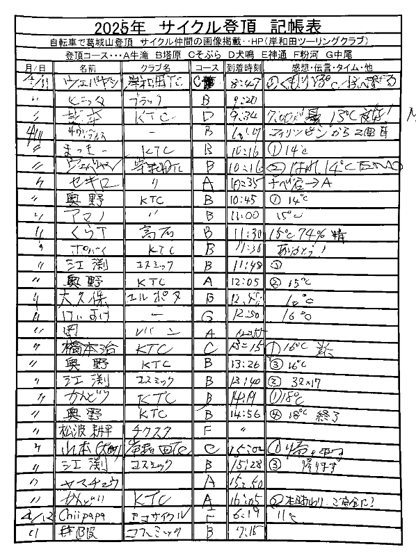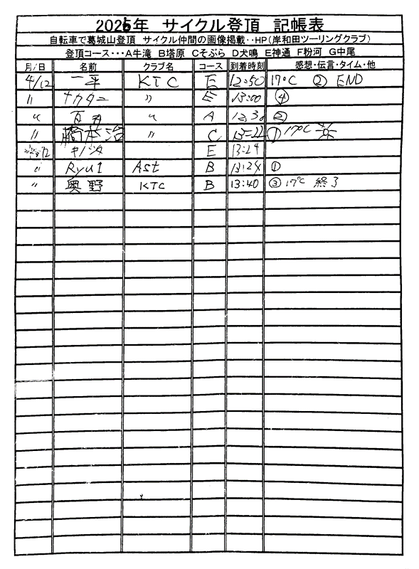 <サイクルの点検、整備、安全に葛城山へ・・上がろう~> <注意・・・落石・枝折れ・倒木・穴ぼこ・落車したら骨折します・> 葛城山の下りは安全運転、油断大敵<車>に注意!・・・・安全第一 ![]() ![]() 2026/04/12 阪神タイガース、勝った勝った又勝った!// 勝利のジェット風船 UP画像・・ 2026/04/08 塔原コースから見る、山桜風景・・// UP画像・・・・ 2026/04/08 葛城山に咲いた山ツツジ・・// 季節の花がアピール・・ UP画像・・・・ 2026/04/08 葛城山で訓練のヘリコプター・・// 大阪湾眺望・・昨年万博開催・・ 2026/04/05 神通コースの上り口に咲くキレイな花・・// 花桃の花かな? UP画像・・・ 葛城山粉河ハイランド ゆたか茶屋の4月度 休日カレンダー・・ ☆彡4月葛城山登頂、回数目標は?・・・☆彡 4月度 回数表 2026/ 4/12~・・NO-01 NO-02 NO-03 2026/ 3月度<140人登頂 560回> 奥野ー63//宇治ー31//ウエバヤシー22//橋本ー18//竹綱ー17// 山本大町ー15//福西ー14//アマノー13// 古川ー12//やなんー12//ナカタニー12//井阪ー11//東野ー11// フジキー10//江渕ー10//ヌマター10//イノウエー10//百井ー09// ハギスミWー09//芝本ー08//セキ口ー08//くらT-08//オクダー08// せおー07//田村勝利ー07//ポパイー07// ☆彡あなたの今月登頂回数目標は?・・・☆彡 3月度 回数表 2026/ 3/30~・・・NO-01 NO-02 NO-03 掲示板 記帳表 2026 4月度 4/12・・ 27~28 28~29 29~30 30~4/02 02~05 05~08 08~09 11~12 12~12 12~・・・ 追加 2026/1~03月度 葛城山登頂 累計回数表 NO-01 NO-02 <単独の鍋谷コースは管理できないので、経由、2本目の葛城山でカウントします。> *掲示板下の写真入れに・・<葛城山のナイスショット画像プレゼント中・・> 掲示板、在庫数量・・<KTCジャージの受付・・窓口、橋本治・ウエバヤシ・> 2025// 1~12月度 年間回数 累計・・・NO-01 NO-02 NO-03 ☆彡 2005~2025まで・・年間 100本以上 葛城山サイクル登頂者 集計ミスは随時訂正・・ NO-01 NO-02 NO-03 NO-04 NO-05 NO-06 NO-07 NO-08 NO-09 NO-10 回数表 2026/02月度 2/01~28・・ NO-01 NO-02 回数表 2026/01月度 1/01~31 NO-01 NO-02 回数表 2025/12月度 01~31日・・・NO-01 NO-02 2025/11月度 01~30日 回数表 NO-01 NO-02 NO-03 2025/10月度 回数表 1~30・・ NO-01 NO-02 NO-03 9月度 回数表 2025/09/01~30・・NO-01 NO-02 NO-03 NO-04 8月度 回数表 2025/08/01~31・・NO-01 NO-02 NO-03 NO-04 7月度回数表 2025/07/01~31・・ NO-01 NO-02 NO-03 NO-04 2025/06/01~30・・・回数表 NO-01 NO-02 NOー03 NO-04 2025 5/01~31・・回数表 NO-01 NO-02 NO-03 NO-04 2025 04/01~30・・回数表 2025・・・NO-01 N0-02 NO-03 NO-04 2025 3/01~31 回数表 NOー01 NO-02 NO-03 NOー04 2025 2/01~28 回数表 NO-01 NO-02 20251/01~31★回数表 NO-01 NO-02 NO-03 2005~2024年まで100回以上・・葛城山へ上がった・累計・・ NO-01 NO-02 NO-03 NOー04 NO-05 NO-06 訂NO-07 NO-08 NO-09 |